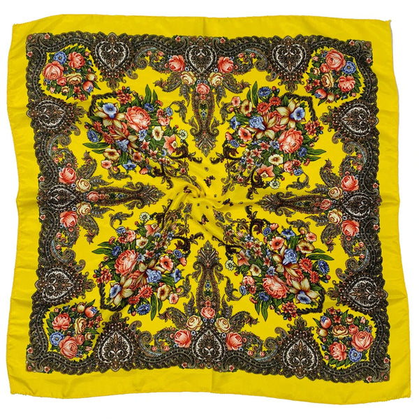 Le Bandana Carré Impérial Jaune incarne l’élégance des foulards traditionnels d’Europe de l’Est. Son fond jaune éclatant est rehaussé par un motif floral riche, encadré de détails inspirés de l’art byzantin. Ce bandana est idéal pour les femmes qui souhaitent accessoiriser leur tenue avec raffinement, que ce soit pour un style bohème, vintage ou classique.
